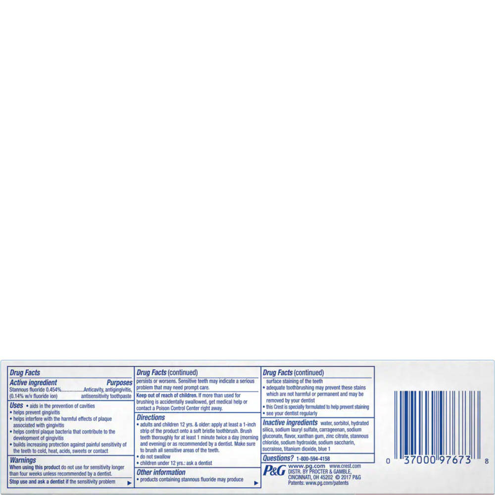 Active Ingredient: Stannous Fluoride 0.454% (0.16% W/v Fluoride Ion)Inactive Ingredients: Glycerin, Hydrated Silica, Sodium Hexametaphosphate, Propylene Glycol, PEG-6, Water, Zinc Lactate, Trisodium Phosphate, Flavor, Sodium Lauryl Sulfate, Sodium Gluconate, Carrageenan, Sodium Saccharin, Xanthan Gum, Blue 1.