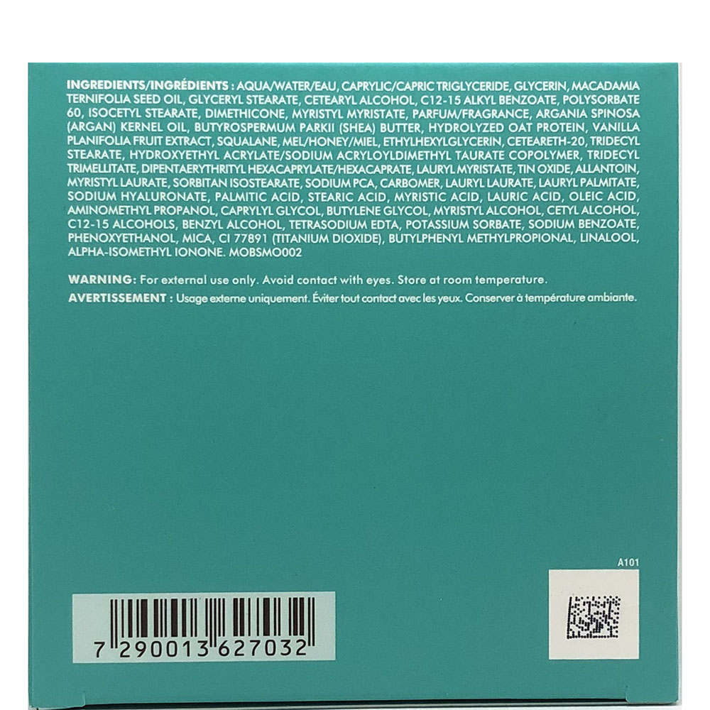 Aqua/Water/Eau, Caprylic/Capric Triglyceride, Glycerin, Macadamia Ternifolia Seed Oil, Glyceryl Stearate, Cetearyl Alcohol, C12-15 Alkyl Benzoate, Polysorbate 60, Isocetyl Stearate, Dimethicone, Myristyl Myristate, Parfum/fragrance, Argania Spinosa (Argan) Kernel Oil, Butyrospermum Parkii (Shea) Butter, Hydrolyzed Oat Protein, Vanilla Planifolia Fruit Extract, Squalane, Honey/mel/miel, Ethylhexylglycerin, Ceteareth-20, Tridecyl Stearate, Hydroxyethyl Acrylate/sodium Acryloyldimethyl Taurate Copolymer, Tridecyl Trimellitate, Dipentaerythrityl Hexacaprylate/hexacaprate, Lauryl Myristate, Tin Oxide, Allantoin, Myristyl Laurate, Sorbitan Isostearate, Sodium Pca, Carbomer, Lauryl Laurate, Lauryl Palmitate, Sodium Hyaluronate, Palmitic Acid, Stearic Acid, Myristic Acid, Lauric Acid, Oleic Acid, Aminomethyl Propanol, Caprylyl Glycol, Butylene Glycol, Myristyl Alcohol, Cetyl Alcohol, C12-15 Alcohols, Benzyl Alcohol, Tetrasodium Edta, Potassium Sorbate, Sodium Benzoate, Phenoxyethanol, Mica, Ci 77891 (titanium Dioxide), Butylphenyl Methylpropional, Linalool, Eugenol, Alpha-isomethyl Ionone, Hydroxyisohexyl 3-cyclohexene Carboxaldehyde. MOBSMO001.