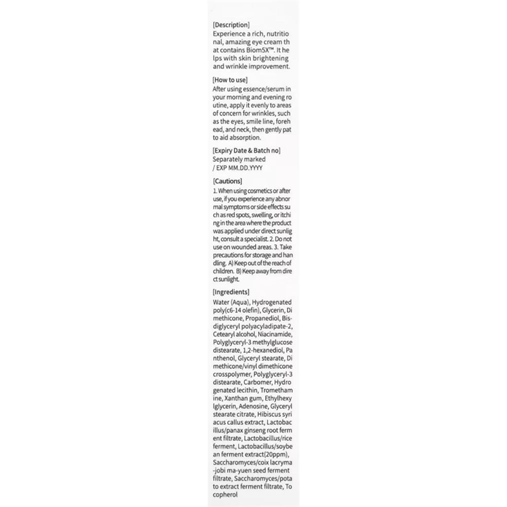 Water (aqua), Hydrogenated Poly(c6-14 Olefin), Glycerin, Dimethicone, Propanediol, Bis-diglyceryl Polyacyladipate-2, Cetearyl Alcohol, Niacinamide, Polyglyceryl-3 Methylglucose Distearate, 1,2-hexanediol, Panthenol, Glyceryl Stearate, Dimethicone/vinyl Dimethicone Crosspolymer, Polyglyceryl-3 Distearate, Carbomer, Hydrogenated Lecithin, Tromethamine, Xanthan Gum, Ethylhexyiglycerin, Adenosine, Glyceryl Stearate Citrate, Hibiscus Syriacus Callus Extract, Lactobacillus/panax Ginseng Root Ferment Filtrate, Lactobacillus/rice Ferment, Lactobacillus/soybean Ferment Extract (20ppm), Saccharomyces/coix Lacryma -jobi Ma-yuen Seed Ferment Filtrate, Saccharomyces/potato Extract Ferment Filtrate, Tocopherol.